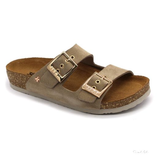 Női nyitott, bőr papucs. Mind a két szíj csattal szabályozható. A talp anatómiai kialakítású, puha velúrbőr talpbetéttel és habszivacs alsó résszel. Ajánlott minden napos otthoni vagy utcai használatra, könnyű nyári sétára ( több órás gyaloglás után sem fárad el a láb ).