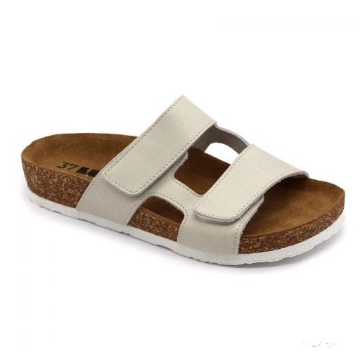 Női nyitott, bőr papucs.Mind a két szíj tépőzárral szabályozható . A talp anatómiai kialakítású parafa, puha velúrbőr talpbetéttel és csúszásmentes habszivacs alsó résszel. Ajánlott minden napos otthoni vagy utcai használatra, könnyű nyári sétára ( több órás gyaloglás után sem fárad el a láb ).