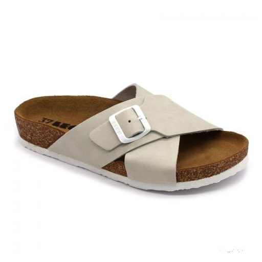Női nyitott, bőr papucs. A felsőrész, a csatnak köszönhetően, a lábhoz igazítható. A talp anatómiai kialakítású parafa, puha velúrbőr talpbetéttel és habszivacs alsó résszel. Ajánlott minden napos otthoni vagy utcai használatra, könnyű nyári sétára ( több órás gyaloglás után sem fárad el a láb ).