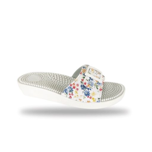 A tüskés talpú papucs a talp érintkező felületeinek masszírozása révén a vérbőséget serkenti, ezáltal jótékonyan fokozza a vérkeringést. Ezen felül boltozati alátámasztás biztosítja a talpforma anatómiai szempontú kialakítását. Felsőrésze a csatos pántnak köszönhetően minden lábformára jól illeszkedik.