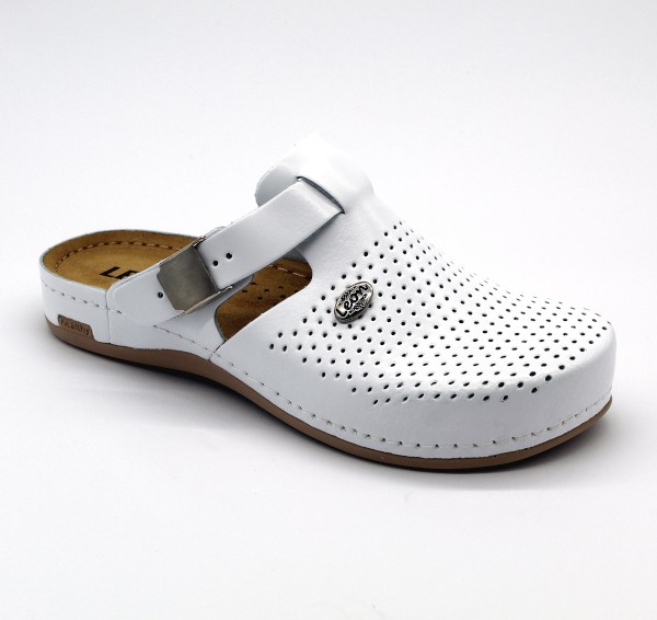 Női bőr klumpa, műanyag csúszásgátlós talppal. Oldalt csat található, amellyel szabályozni lehet a bőséget. A talpbetét puha zselés, bőr. A természetes anyagnak és a felsőrész lyukacsosságának köszönhetően , jól szellőzik. Ajánlott: mindennapos utcai használatra, otthonra vagy munkahelyre ( több órás, szaladgálós munka alatt sem fárad el a láb ). Ez a termékünk rendelkezik minőségi, munkavédelmi bevizsgálással.