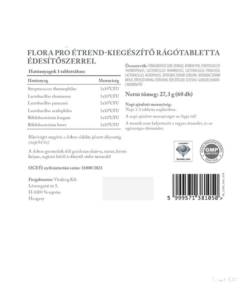 A Vitaking FloraPro rágótabletta egy szabadalmaztatott bevonási eljárással dupla bevonatot hozunk létre, megvédve a gyártás során fellépő behatásoktól (első réteg) és a gyomorban található erős savaktól (második réteg) őket. A termékben összesen 6 féle baktériumtörzs található, ebből kettő bifido baktérium, 4 laktobacilus. Mindegyikben 109 élő sejt van, a garancia-idő végéig. Gyártáskor ennél jóval nagyobb, azért, hogy a garanciaidő végéig, még mindig benne legyen az, ami a doboz hátuljára rá van írva.