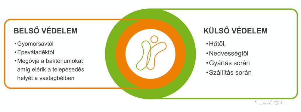 Ezek a baktériumok nagyon érzékenyek a környezeti hatásokra és semmit nem érnek amennyiben elpusztulnak. Ezért a termékben egy szabadalmaztatott bevonási eljárással dupla bevonatot hozunk létre, megvédve a gyártás során fellépő behatásoktól (első réteg) és a gyomorban található erős savaktól (második réteg) őket. Ezzel védjük meg a baktériumokat addig, amíg eljutnak a számukra biztonságot jelentő bélszakaszba.